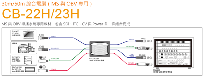 CB-22H/CB-23H/CB-24綜合電纜線材,只要提供現場單線方式作業,CB-22H/CB-23H主要做為SD或HD-SDI的訊號作業,而CB-24則單純提供SD-SDI的訊號作業方式。