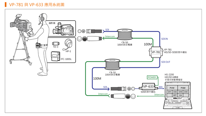 但是遇到更長的距離時,CB-50就必須使用VP-781的訊號放大延長傳輸器,可將將2條CB-50串接一起達到200米的長度,可將CB-50綜合線材使用在更大的活動現場使用。